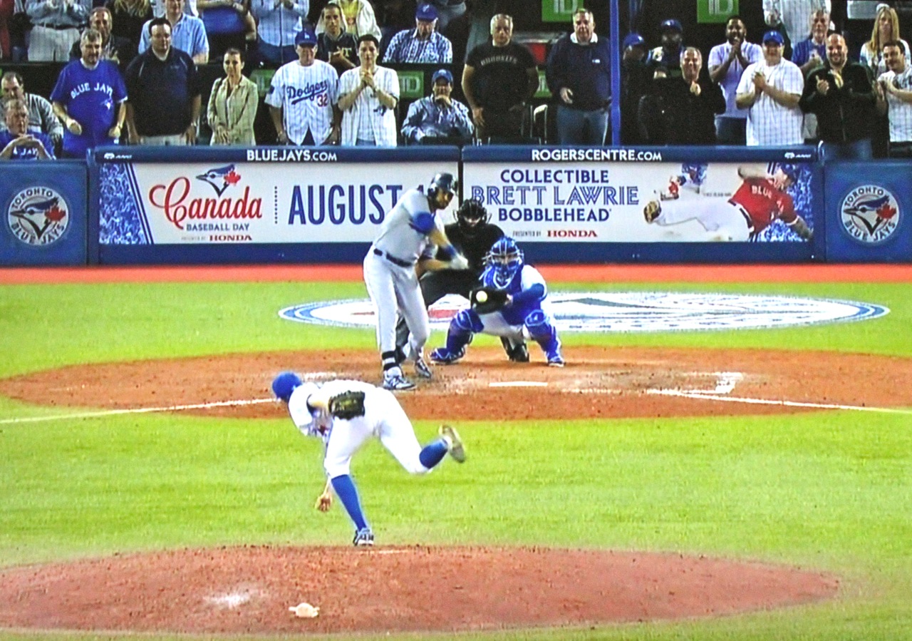 Ethier’s ball hits the artificial turf and bounces high over the head of Blue Jay center fielder Colby Rasmus.
