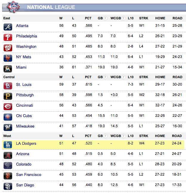 Another sweep, their 10th consecutive win on the road (an L.A. Dodger record), and a perfect 6-0 since the All-Star break. I’ve said it before and I’ll say it again … it seems like they just can’t lose at this point. Every game, no matter the obstacle (three costly errors in yesterday’s game, for example), they find a way to win and win big. Oh my goodness.