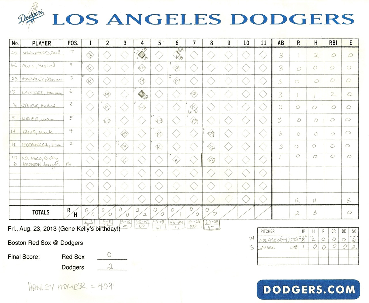 Dodger pitcher Ricky Nolasco and Bosox hurler John Lackey matched each other nearly pitch for pitch. They each went eight innings, they each struck out six batters and walked none, even their pitch counts were close: Nolasco threw 101 pitches, 66 for strikes, and Lackey made 97 pitches, 69 for strikes. Only problem for the Red Sox, one of those was knocked out of park by Hanley Ramirez.
