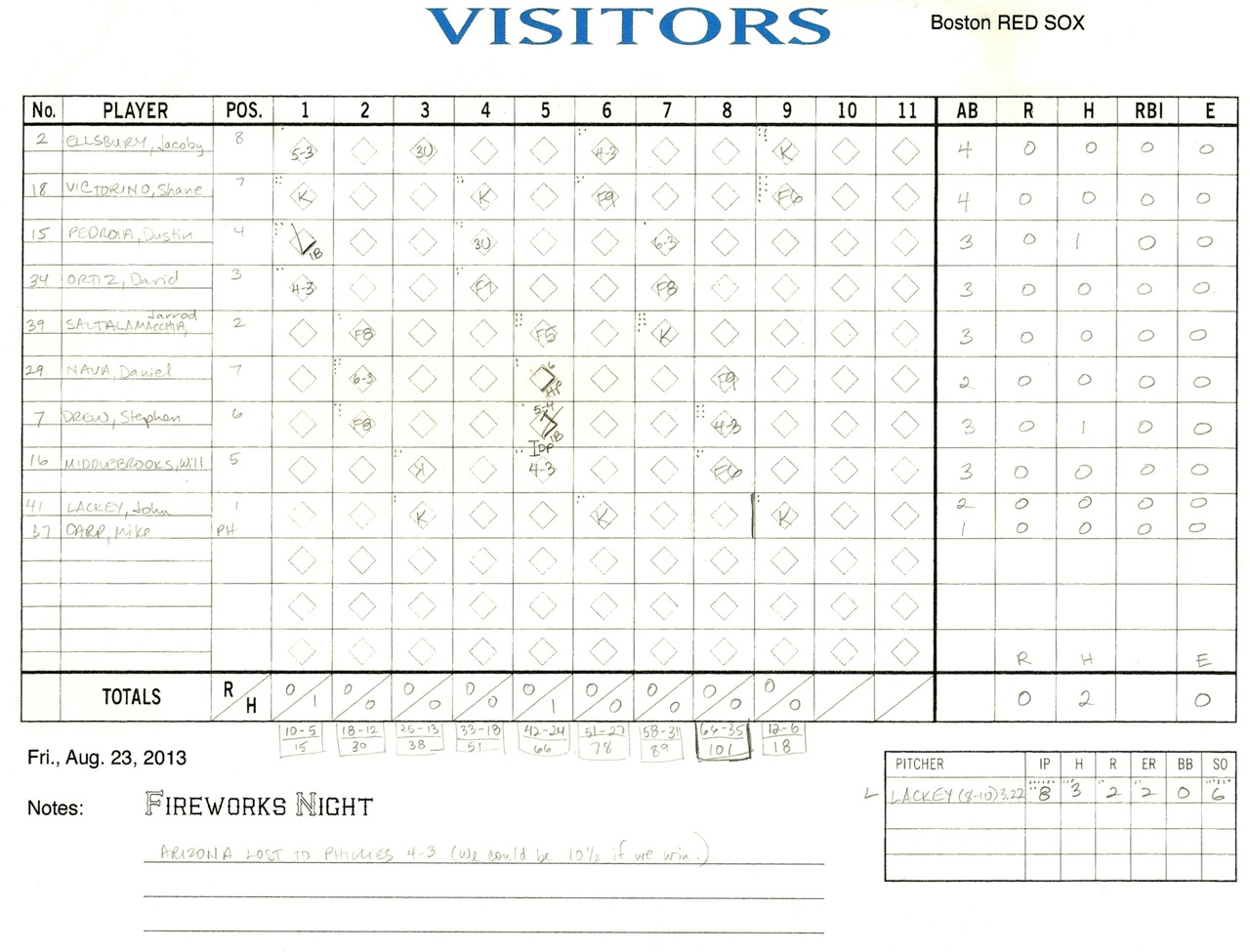 Instead of linking to the mlb.com box score, I’m furnishing you with my own personal score cards. I will do this when I can for as many of the remaining games as I’m going to this season. (But today, since I’m still writing this with less than an hour before the game starts, I probably won’t be keeping score. I don’t like to do it if I’m late … or if it’s hot and I have to follow the shade at the ballpark.)