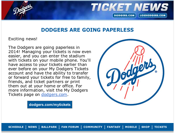 dodgers tixHowever, the Dodgers always seem to take one step forward and two steps back in making us loyal Dodger fans happy. I got this email from the organization that put a dent in my excitement for the new season. I am not thrilled to find that the Dodgers are going paperless. As my friend, Emma Amaya, has written on her excellent blog, it’s exciting to receive that packet of all the tickets for all the home games of the coming season. It’s a shame that we will miss that from now on.
