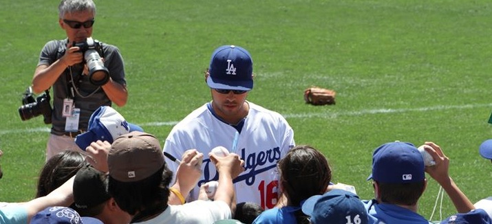 Outfielder Andre Ethier signs balls for people at Camelback Ranch in 2012.