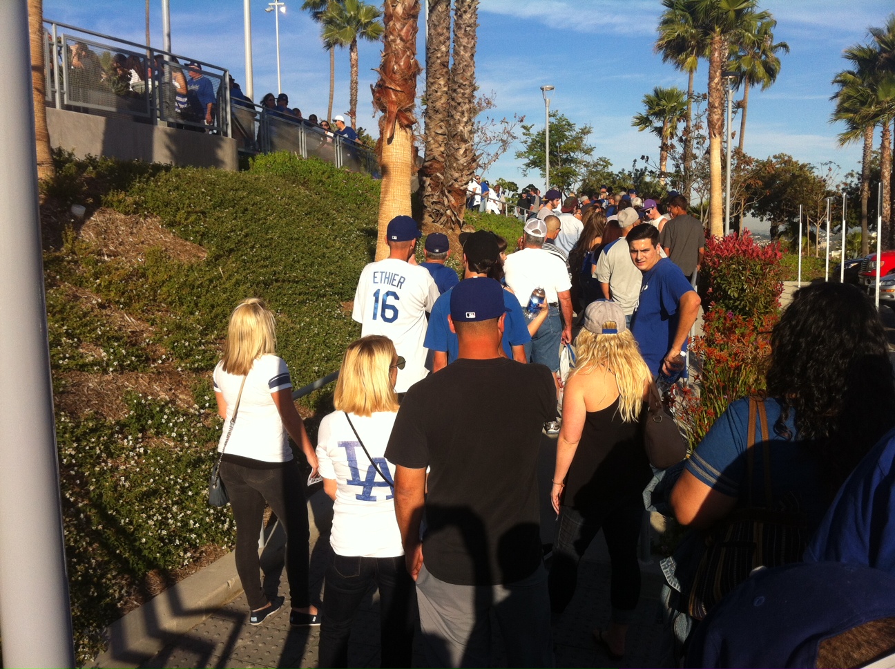 Steve and I got to Chavez Ravine two hours before the first pitch last night, only to be greeted by an hourlong wait just to get into the gate. This is no hyperbole. We got to the steps up to the Top Deck plaza and were greeted with a choice of two lines: one went down the stairway to Reserve Level and then all the way across the Reserve Level lot. The other wound around the handicap ramps from Parking Lot P up to the plaza in front of the Top of the Park gift shop.