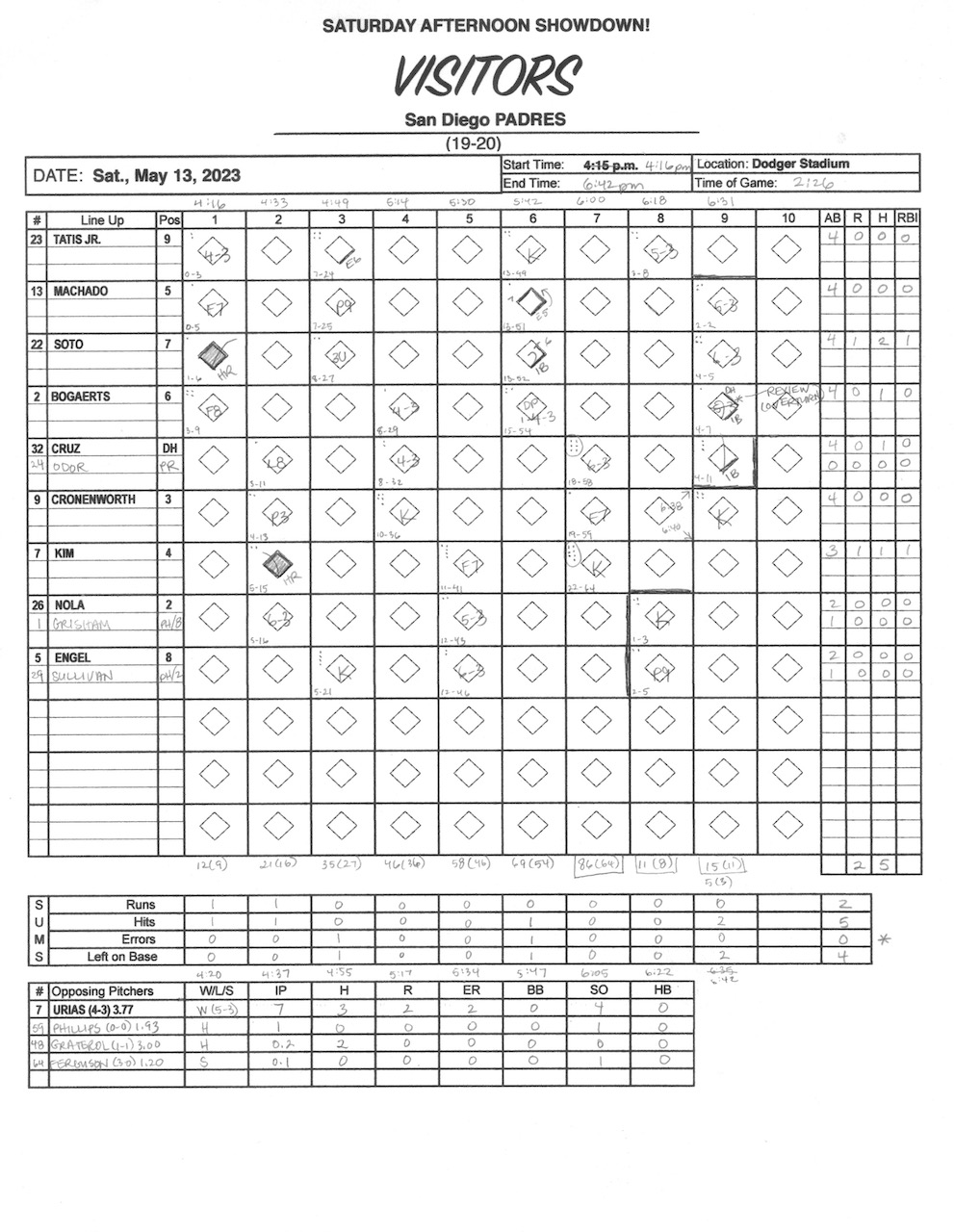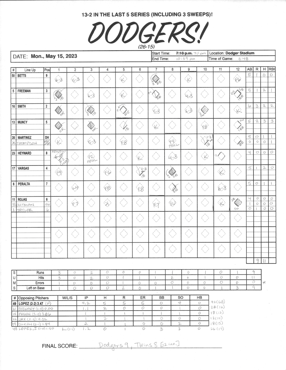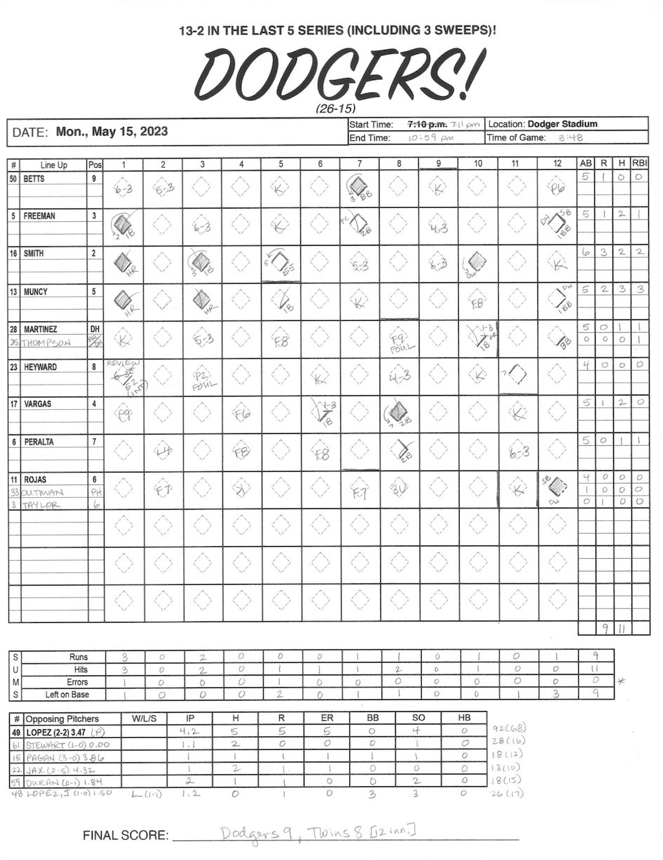 PS: When I got home from this marathon baseball game, I re-created my scorekeeping on a 12-inning card. I present the final product: