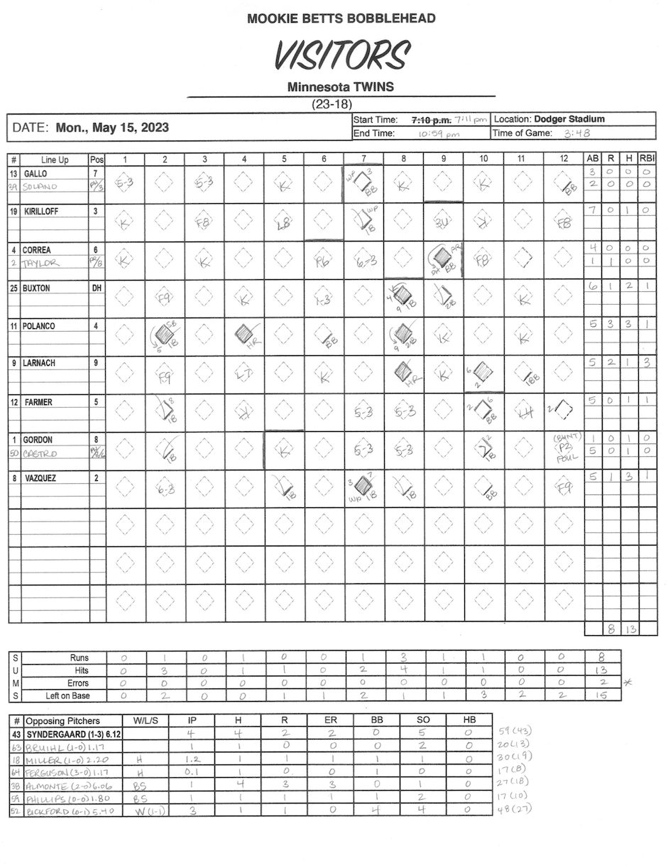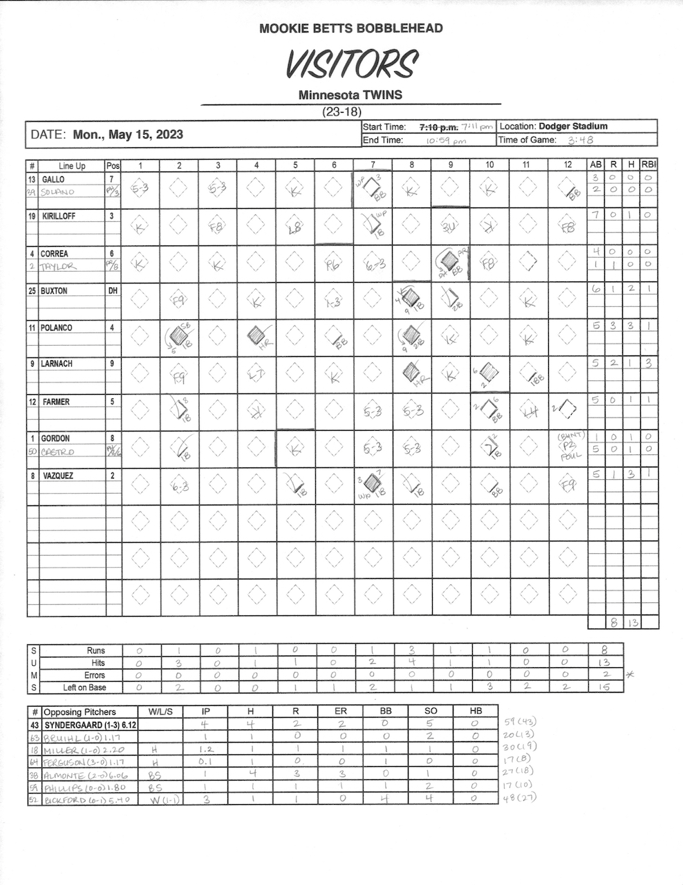 The next day (Monday, May 15) was Mookie Betts Bobblehead Night, and Stephen and I both went. It started out great for our team: we took a 5-2 lead into the 5th inning with Syndergaard on the mound. He had to leave then — I think his finger hurt — and gradually, the relievers called in to finish for him allowed the Twins to catch up. By the end of the 9th, it was 7-7, and we were headed for extra innings.