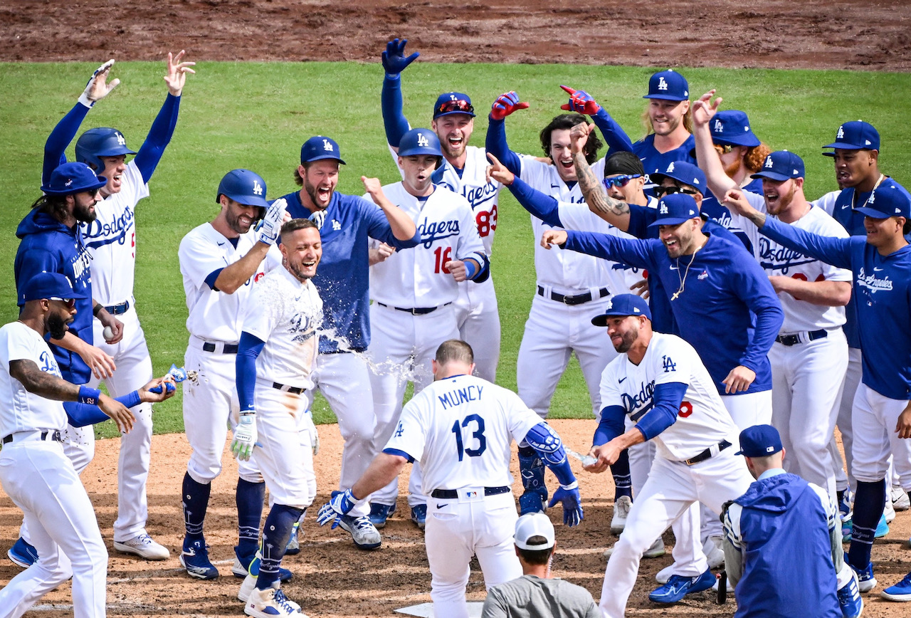 Thompson sees a ball, then fouls one off, then watches a sinker go right over the plate. The count 1-2, he watches the next three balls go over the plate with the patience of a saint, and he pulls off a walk-off walk. The Dodgers win 9-8, and the 20,000 or so left in the stadium go apeshit! Thompson valiantly fought off attempts to strip him of his jersey, but his teammates still made him aware how much they appreciated it!