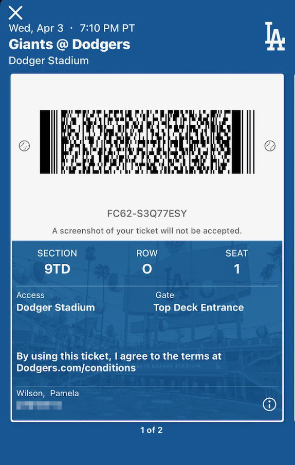 This year, they’re cracking down, as you can see by this ticket from a recent Giants game. “A screenshot of your ticket will not be accepted,” it says. Why not? What possible difference could it make to the Dodgers if my husband brings his stupid little paper ticket to the game? Apparently, they are serious, judging by the personalized email I got after the first homestand of this season telling me, “No more paper tickets!”