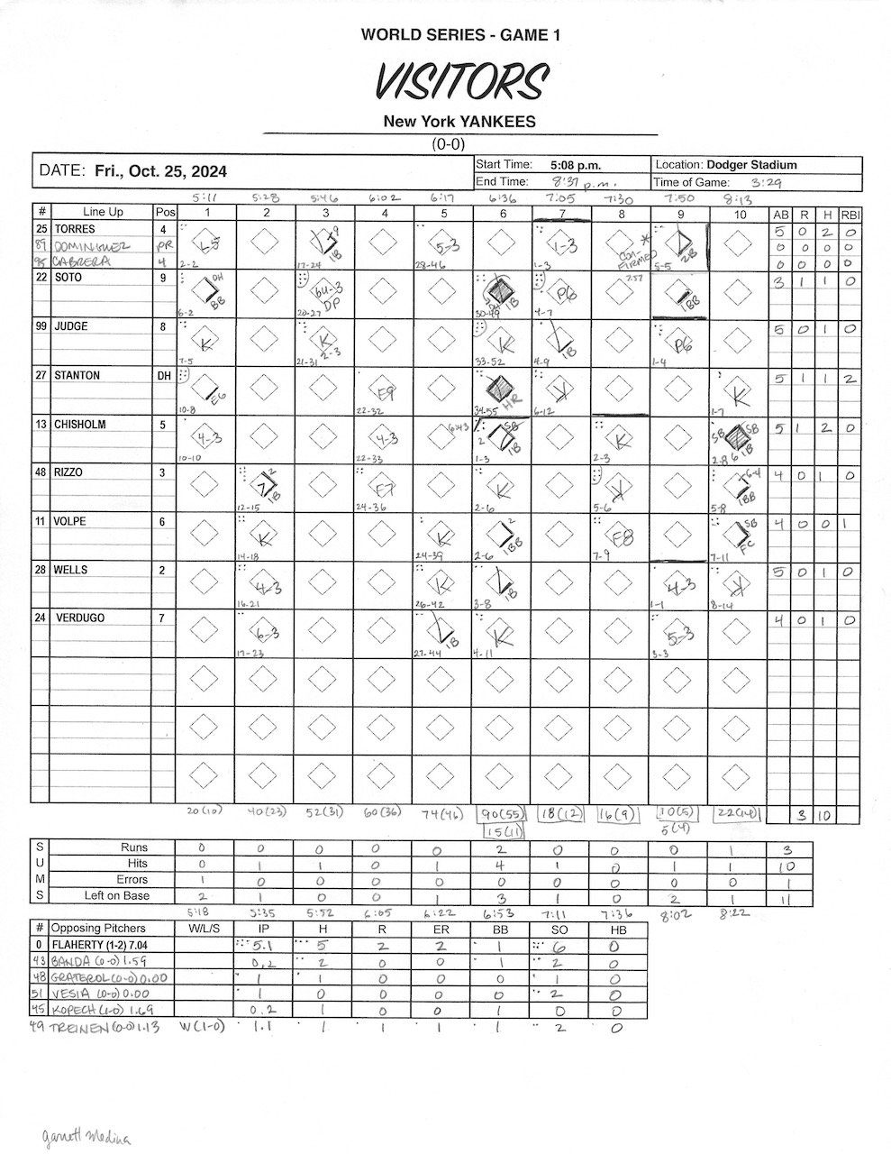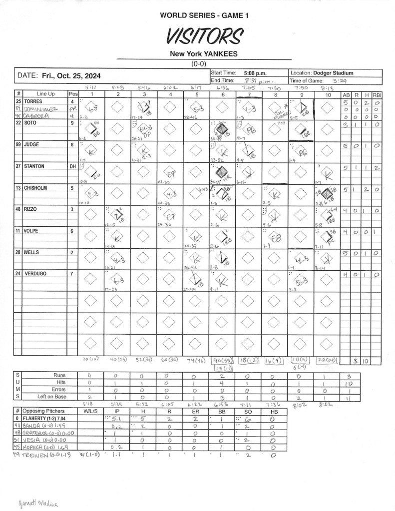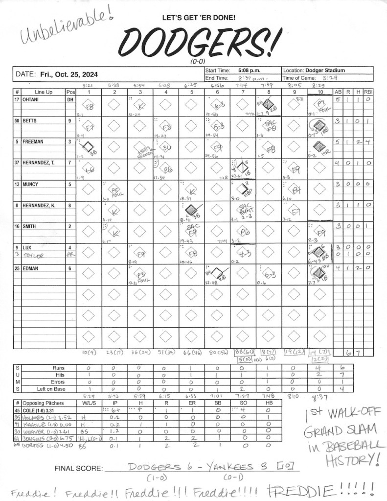 I didn’t take score for most of the games this postseason. Too crowded, plus I wanted to roam and see folks around the stadium. But yesterday, right before we left to walk up the Ravine, I decided, “It’s the freaking World Series, Dodgers vs. Yankees! Of course I have to keep score!”