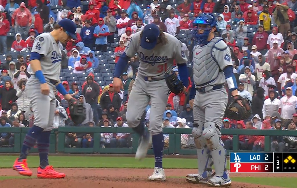 Dodgers pitcher Tyler Glasnow tries to rid his cleats of muck during the team’s second loss to the Phillies over the weekend.
